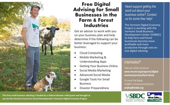 Vermont Digital Economy Project partners, VCRD and VtSBDC, are offering free digital advising for farm and forest businesses