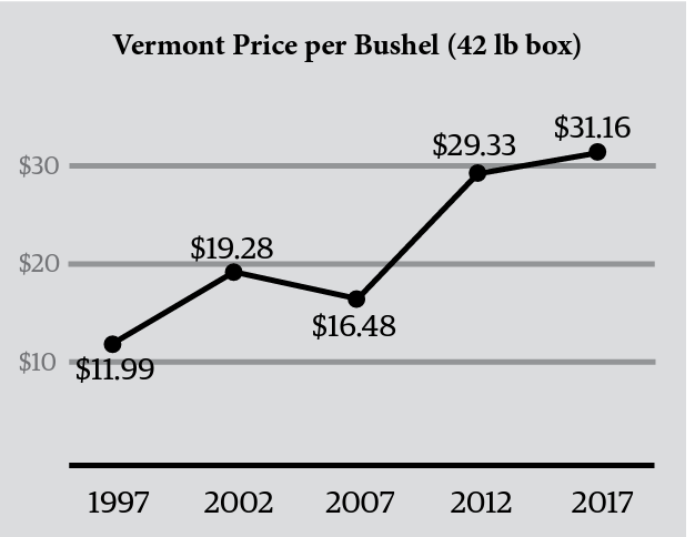 Apples in Vermont are behind only dairy and maple in total annual crop value. Since the 1990s, Vermont’s share of all apples sold to eastern U.S. wholesale markets has decreased. Apple acreage fell from approximately 3,500 acres in 2001 to 1,700 acres in 2017. Local sales at pick-your-own and farm stand sales have increased, and cider markets have grown, but have not replaced lost volume nor revenue from wholesale sales. Some Vermont orcharding communities are seeing a loss of economic activity from crop sales and farm employment and the disenfranchisement of growers. Without supportive policies and more investment in marketing, technical assistance, and supply chain coordination, Vermont growers will continue to lose out to growers in regions where larger concentrations of orchards have the advantage in efficiency, modernization, and infrastructure.